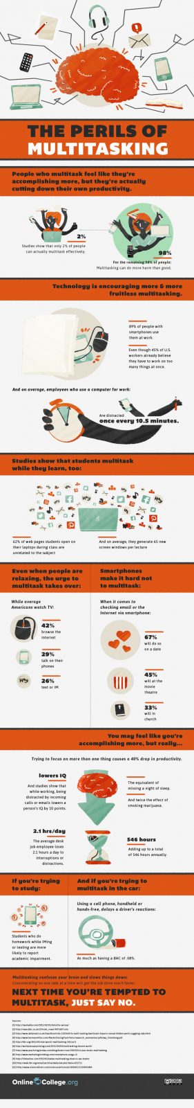 Enquanto a multitarefa é uma habilidade importante ela também tem um lado negativo. Ela reduz a nossa inteligência, fazendo com que o nosso QI caia. Com isso, cometemos erros, perdemos alguns sinais sutis e até perdemos o controle quando não deveríamos.